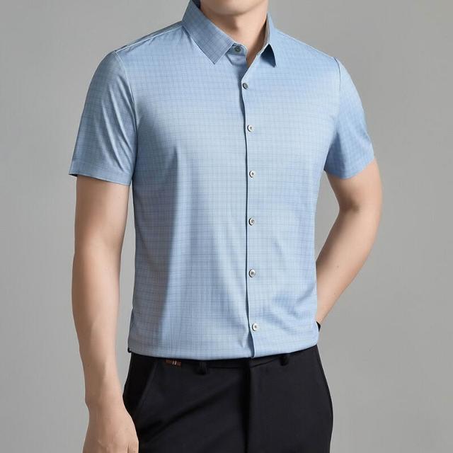 簡優 男士桑蠶絲短袖襯衫夏季高端無痕冰絲上衣商務潮流爸爸裝格子襯衣