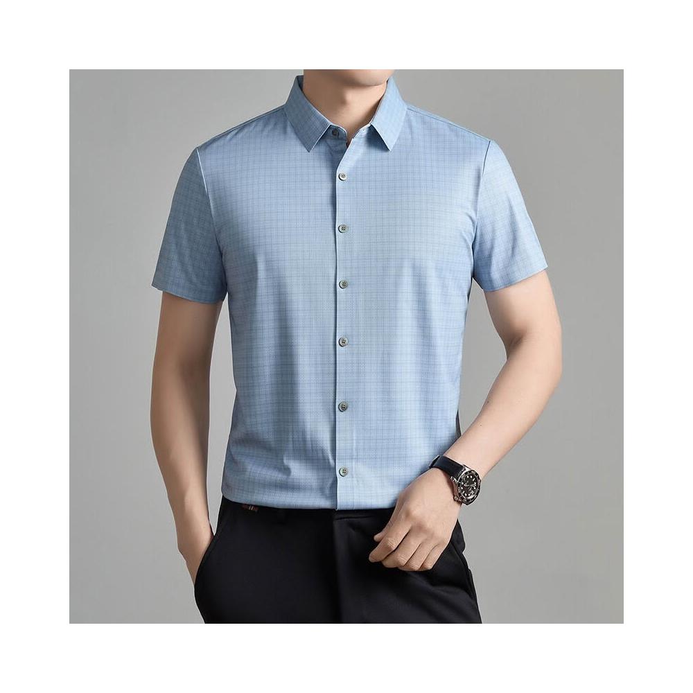 簡優 男士桑蠶絲短袖襯衫夏季高端無痕冰絲上衣商務潮流爸爸裝格子襯衣