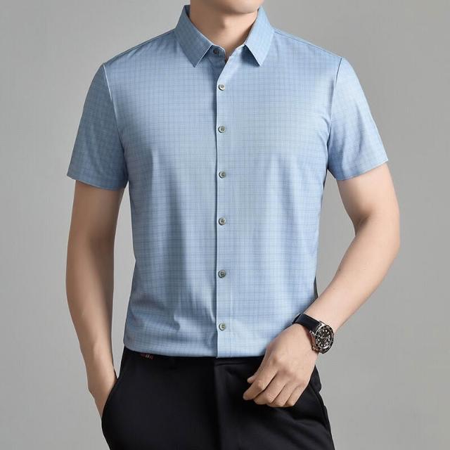 簡優 男士桑蠶絲短袖襯衫夏季高端無痕冰絲上衣商務潮流爸爸裝格子襯衣