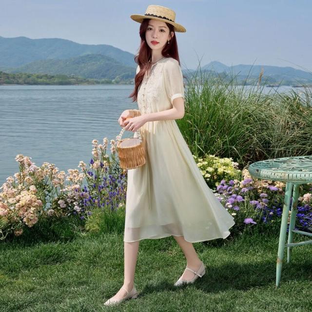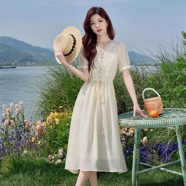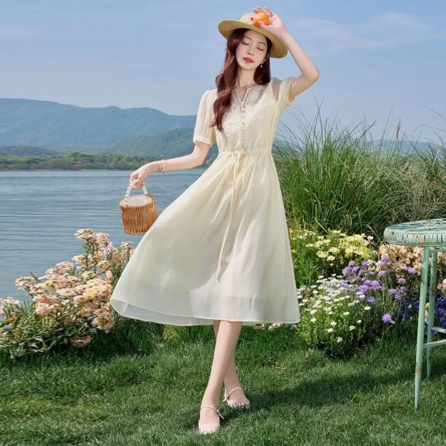 簡優 天絲時尚V領短袖連衣裙女2025夏季新款優雅氣質顯瘦中長裙