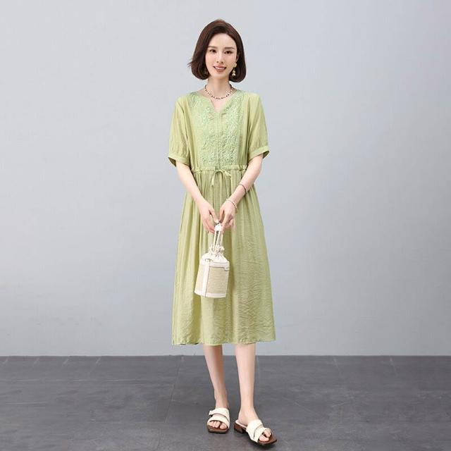 簡優 夏季新款優雅連衣裙氣質收腰遮肚子顯瘦V領刺繡天絲法式A字裙
