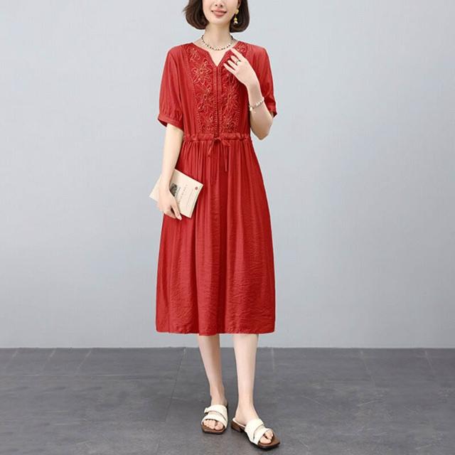 簡優 夏季新款優雅連衣裙氣質收腰遮肚子顯瘦V領刺繡天絲法式A字裙