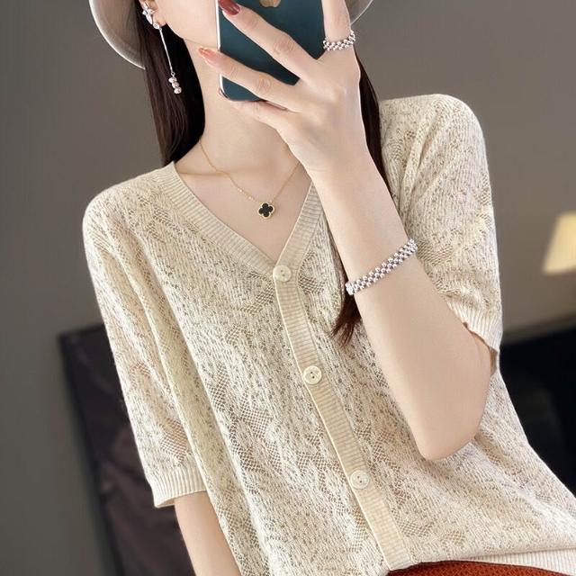 簡優 精紡镂空純色針織短袖開衫女半袖T恤衫春夏新款寬松大碼上衣