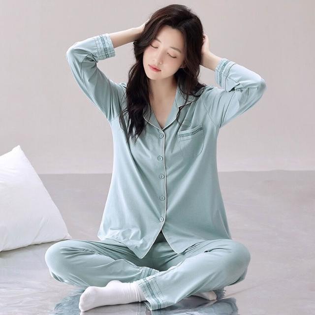 簡優 女士睡衣莫代爾棉綢薄款春秋款長袖媽媽大碼開衫夏天空調房家居服