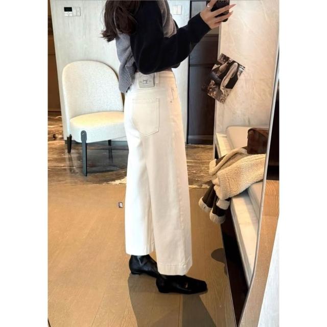 簡優 韓系米白色高腰九分闊腿牛仔褲女春夏寬松顯瘦休閑彈力直筒奶奶褲