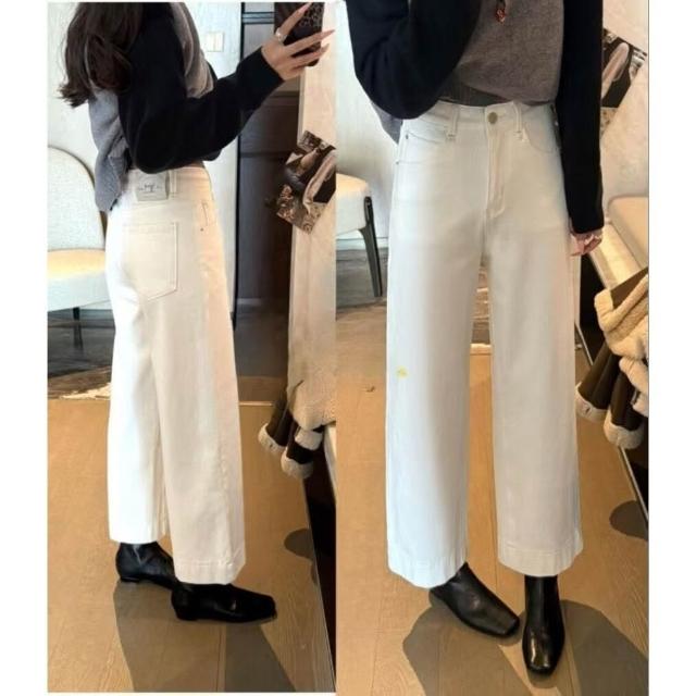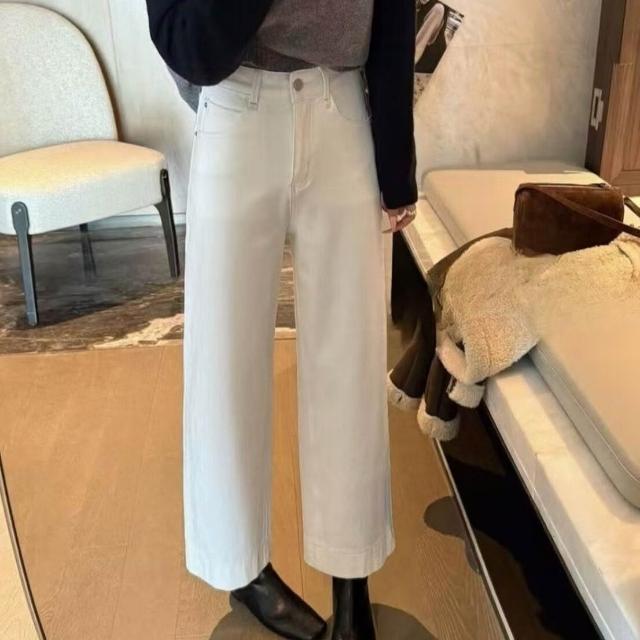 簡優 韓系米白色高腰九分闊腿牛仔褲女春夏寬松顯瘦休閑彈力直筒奶奶褲