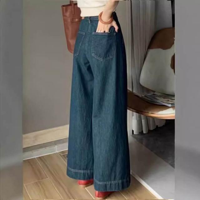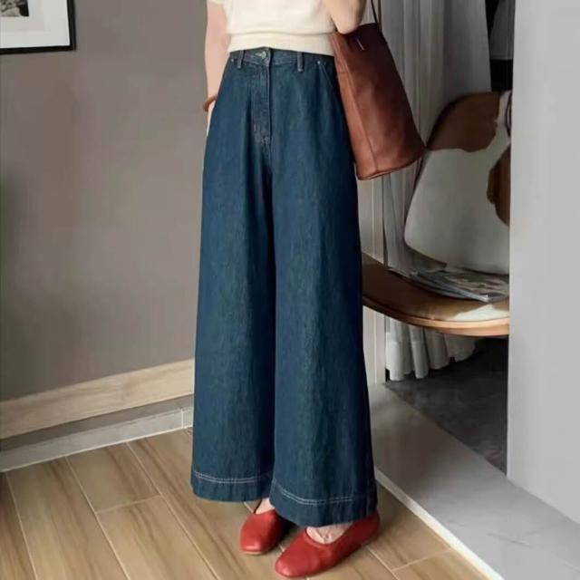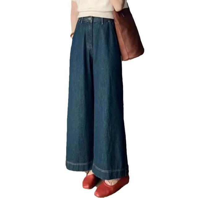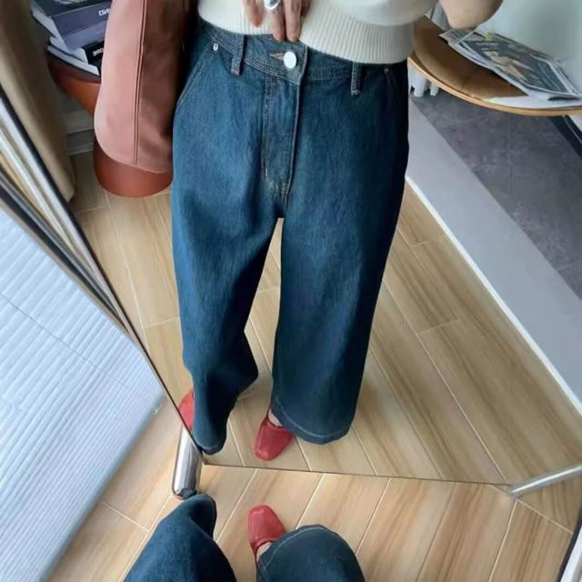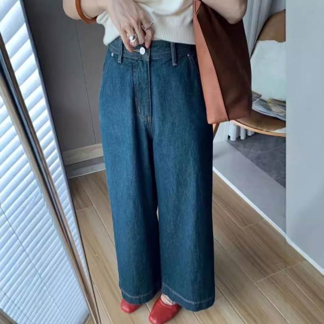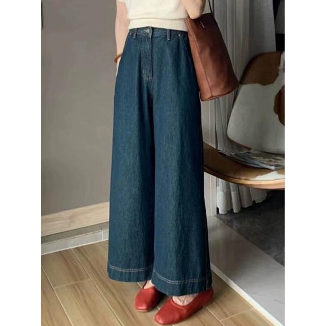 簡優 復古普洗藍直筒牛仔褲女夏季款高腰寬松百搭小個子九分闊腿奶奶褲