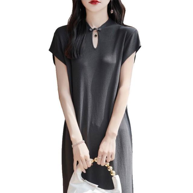 簡優 新中式國風立領曲珠針織連衣裙女短袖夏季新款純色盤扣長裙