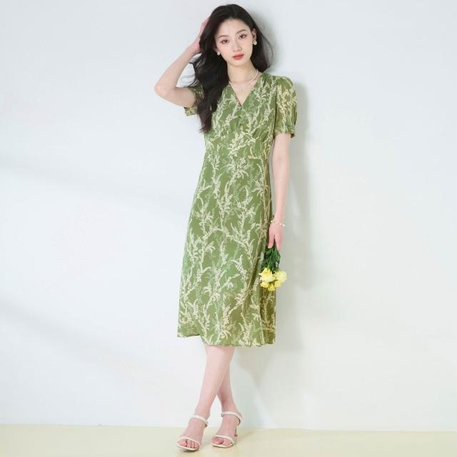 簡優 夏季牛油果綠雪紡印花茶歇裙V領優雅氣質收腰顯瘦連衣裙