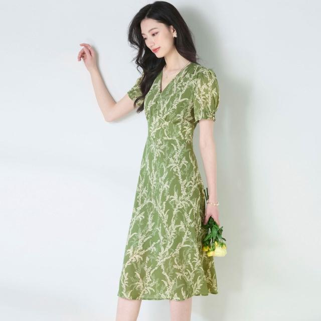 簡優 夏季牛油果綠雪紡印花茶歇裙V領優雅氣質收腰顯瘦連衣裙