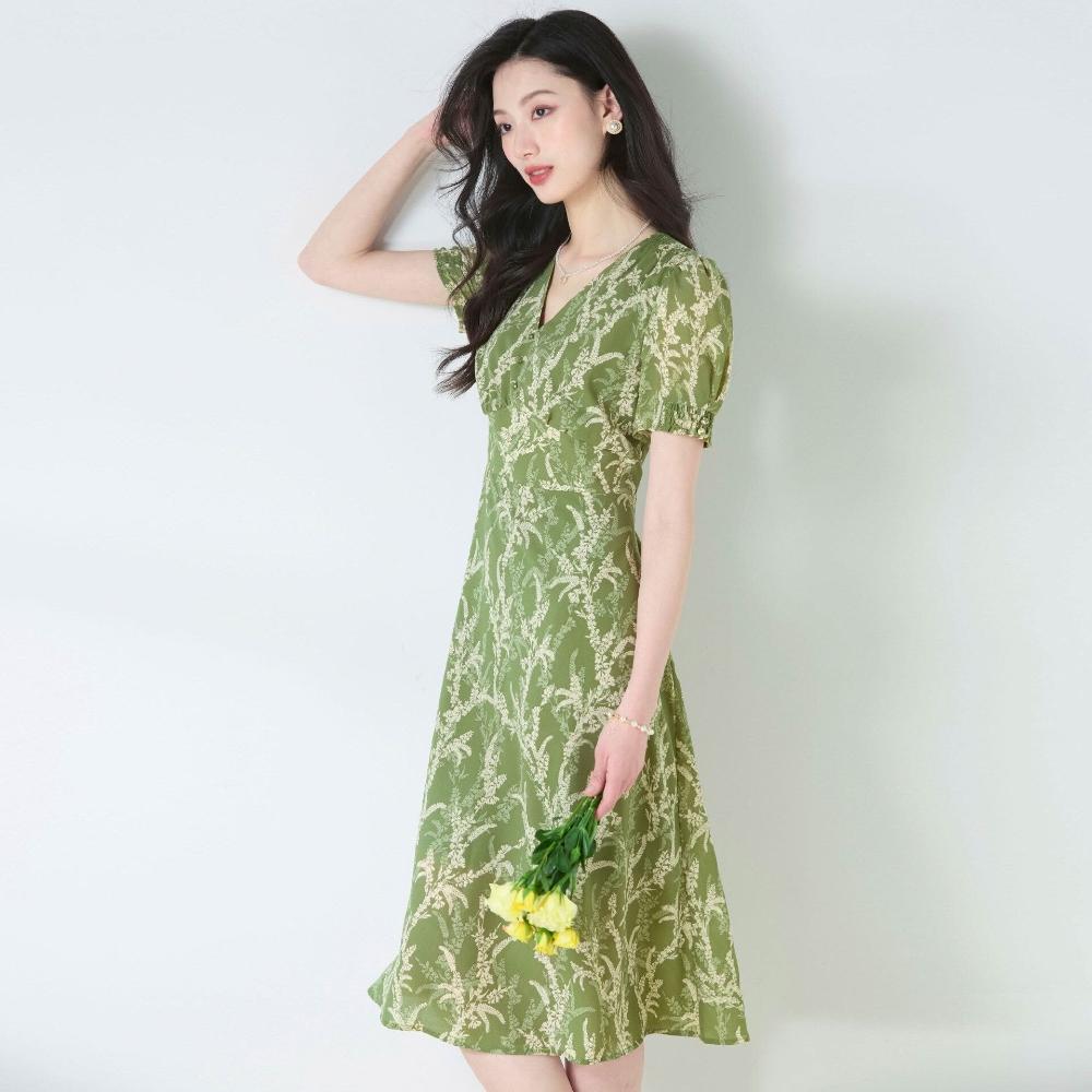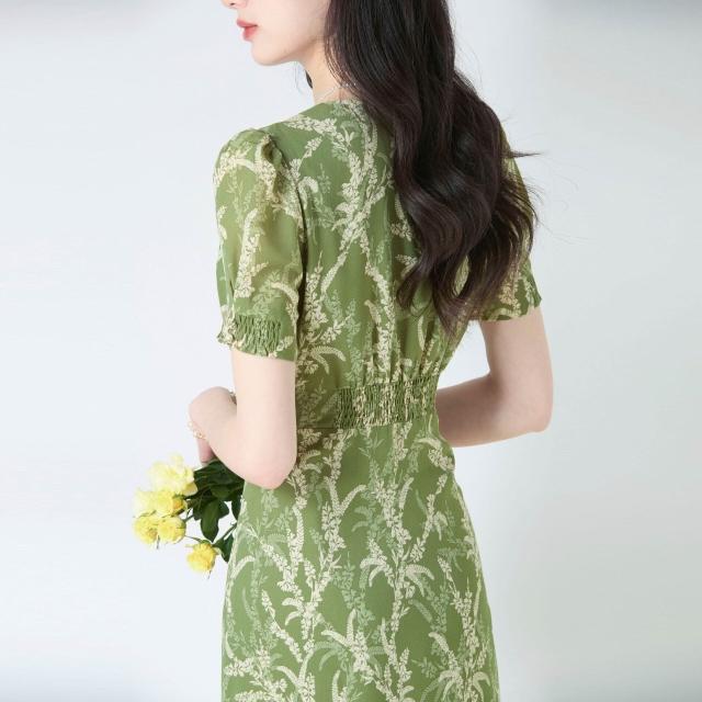 簡優 夏季牛油果綠雪紡印花茶歇裙V領優雅氣質收腰顯瘦連衣裙