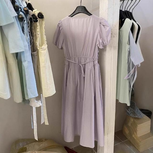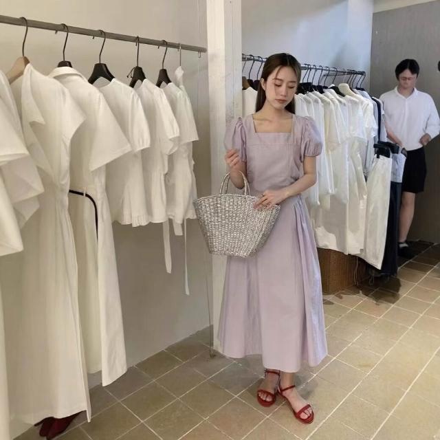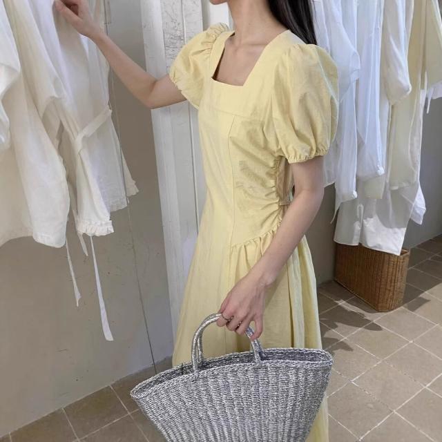 簡優 方領泡泡袖連衣裙女夏季新款氣質溫柔收腰系帶長裙茶歇裙