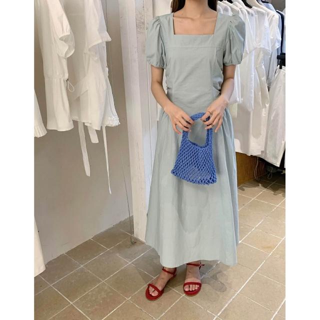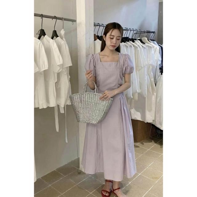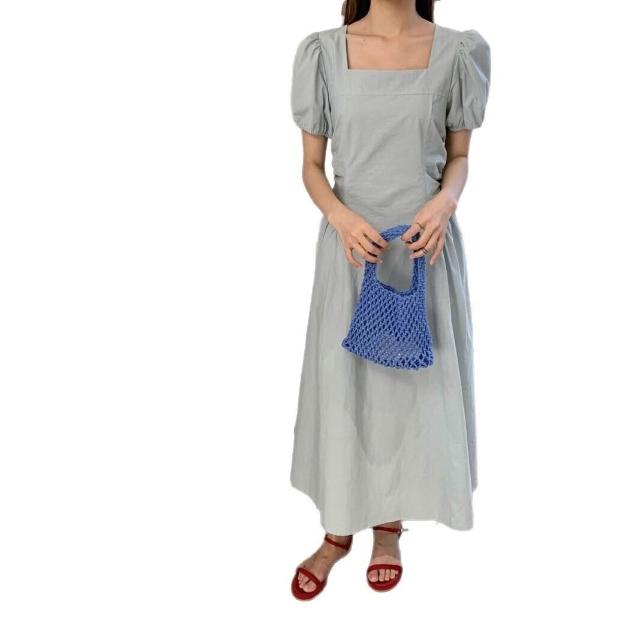 簡優 方領泡泡袖連衣裙女夏季新款氣質溫柔收腰系帶長裙茶歇裙