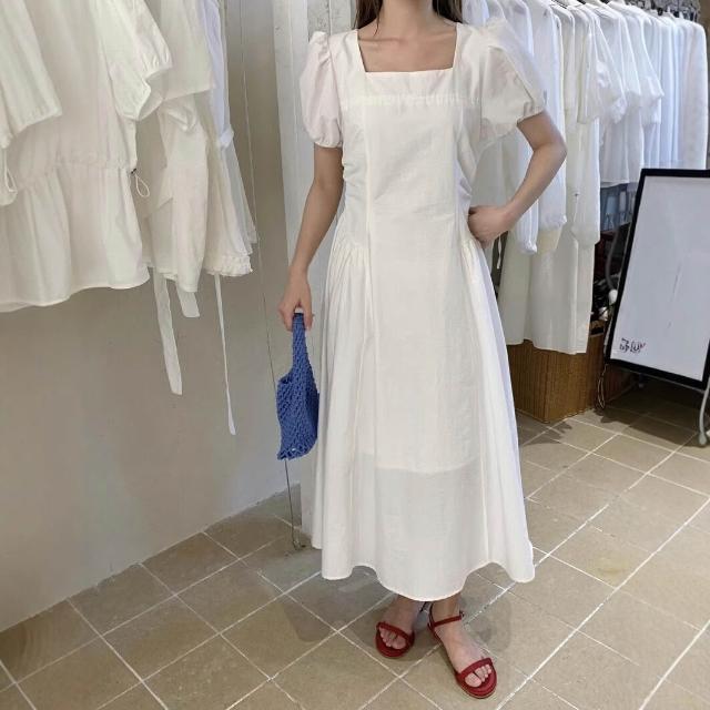 簡優 方領泡泡袖連衣裙女夏季新款氣質溫柔收腰系帶長裙茶歇裙