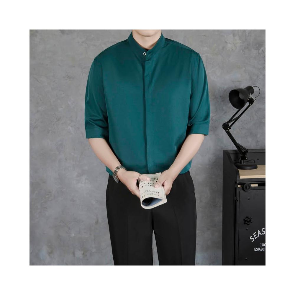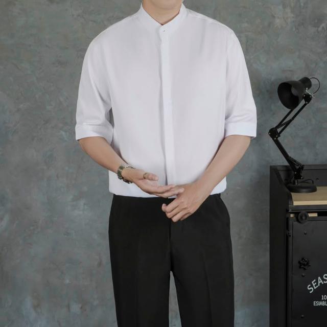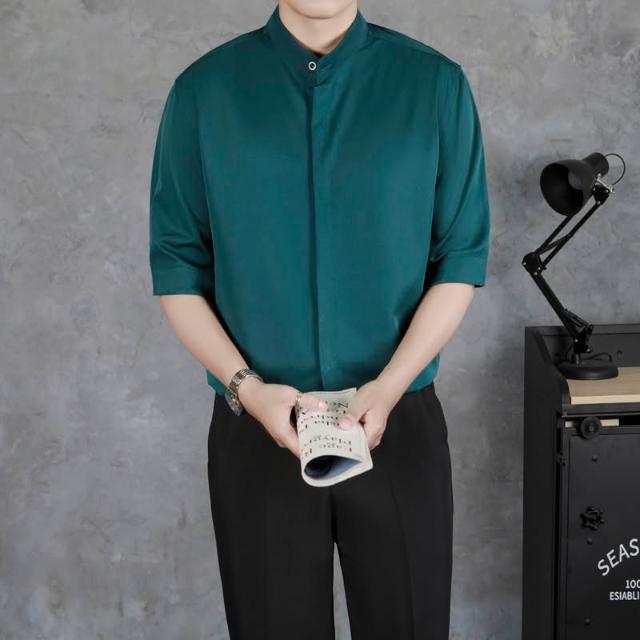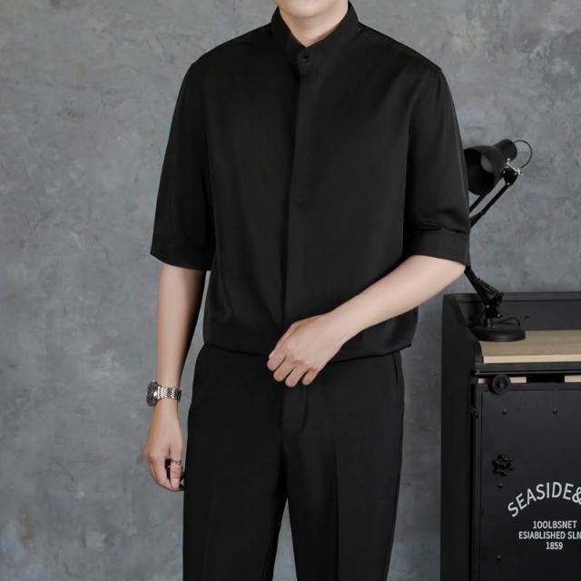新款那不勒斯黑色冰絲立領短袖襯衫男ins簡約潮流氣質原宿