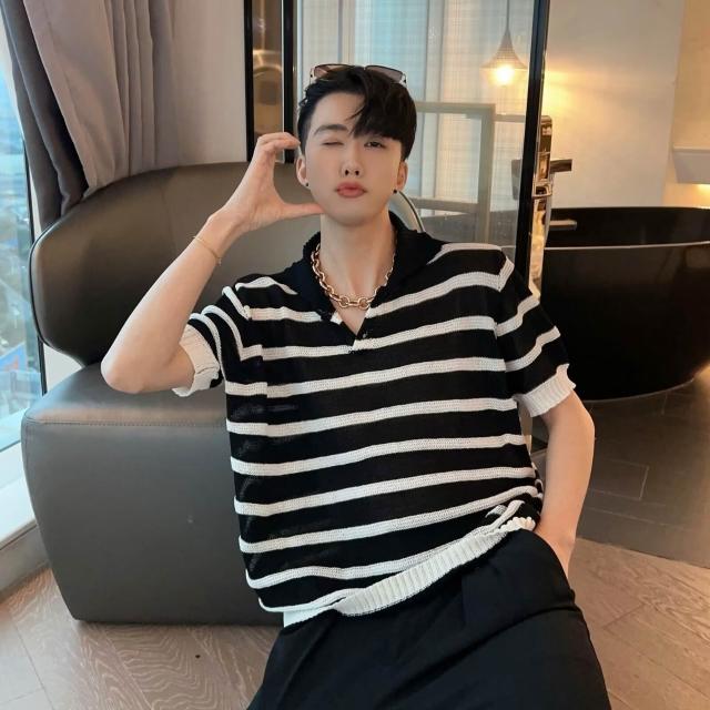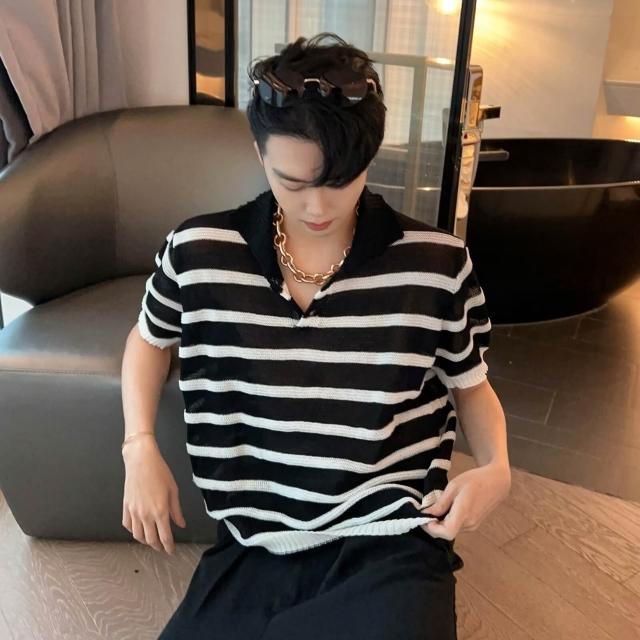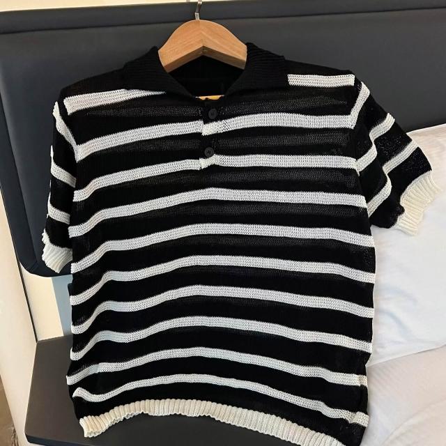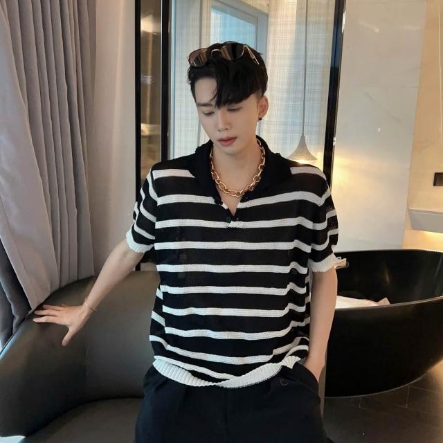 夏季新款條紋撞色POLO針織衫男短袖翻領寬鬆百搭上衣潮黑白短袖