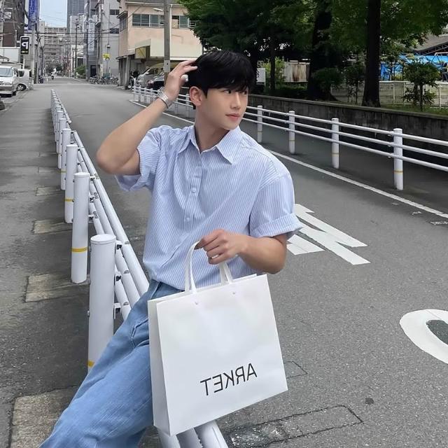 藍色條紋短袖襯衫男女夏季新款韓系男友風穿搭小眾設計感寬鬆襯衣
