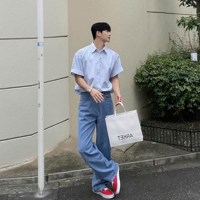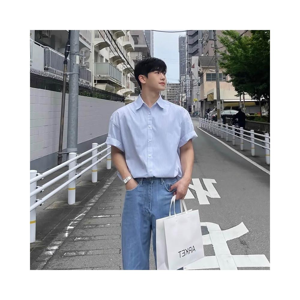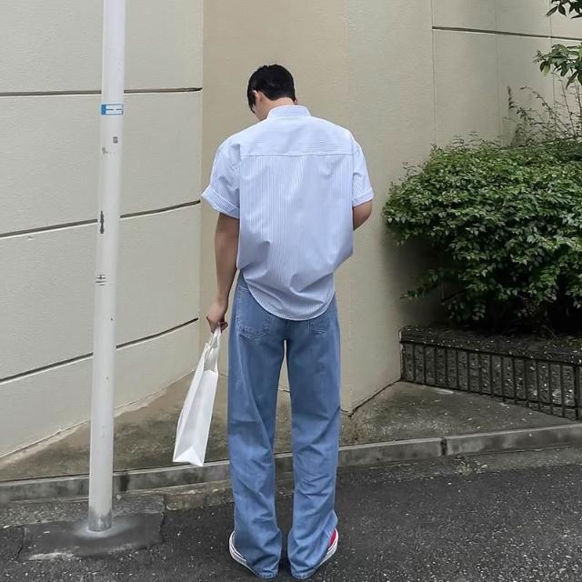 藍色條紋短袖襯衫男女夏季新款韓系男友風穿搭小眾設計感寬鬆襯衣