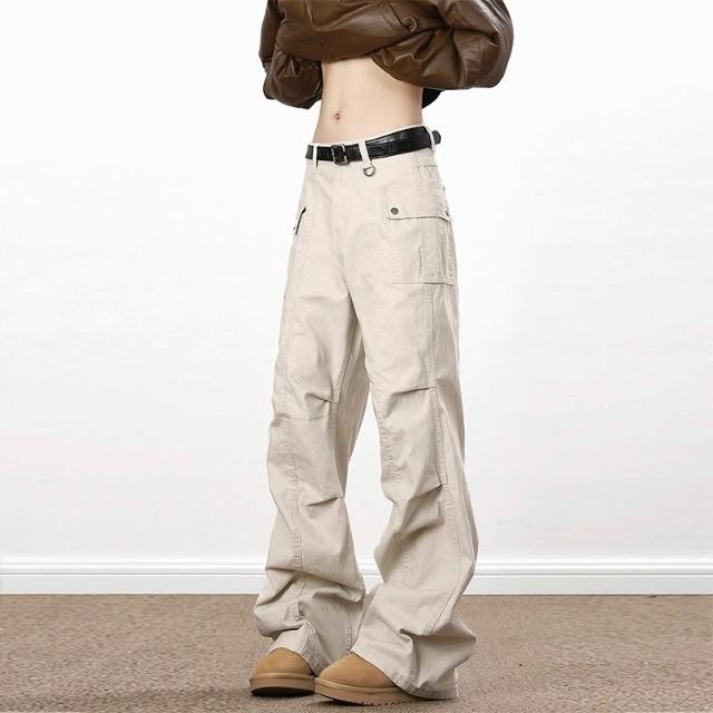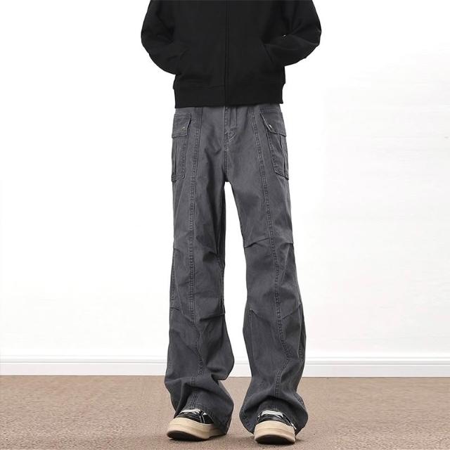 免運 美式復古水洗做舊工裝褲男女春季寬鬆褶皺直筒休閒褲