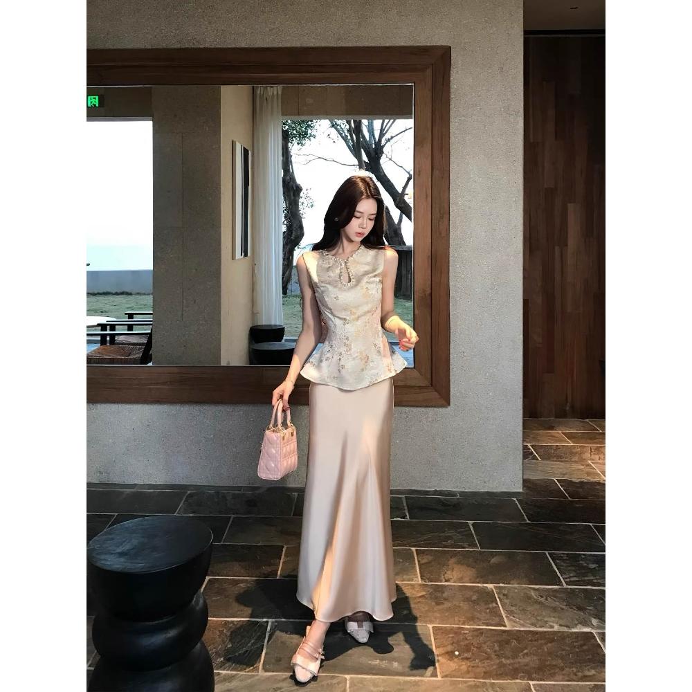 免運 新中式高級緞面提花無袖收腰馬甲上衣垂感半身裙套裝夏