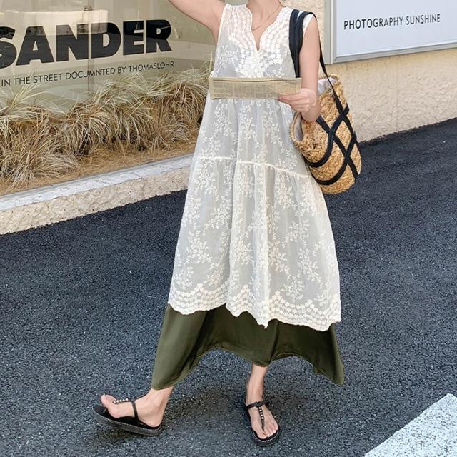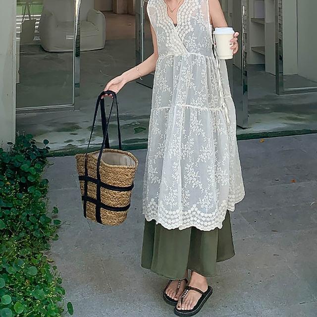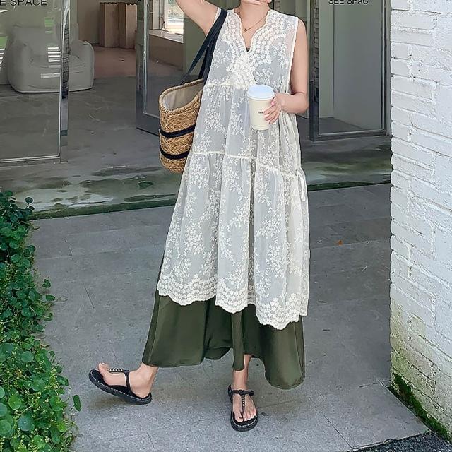 免運 韓系絕美蕾絲無袖罩衫套裝裙春夏季2026新款疊穿吊帶連衣裙兩件套