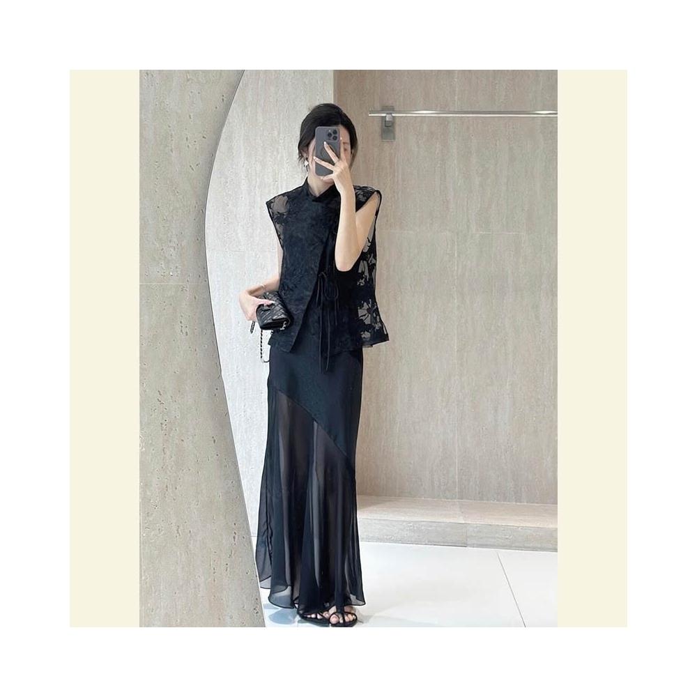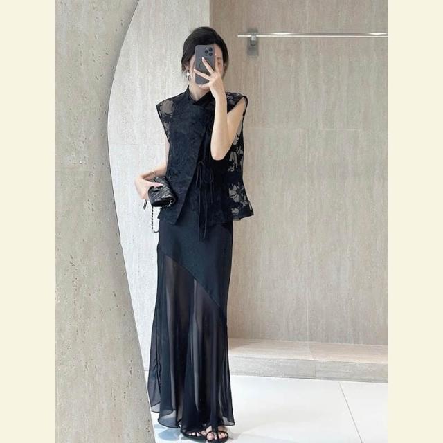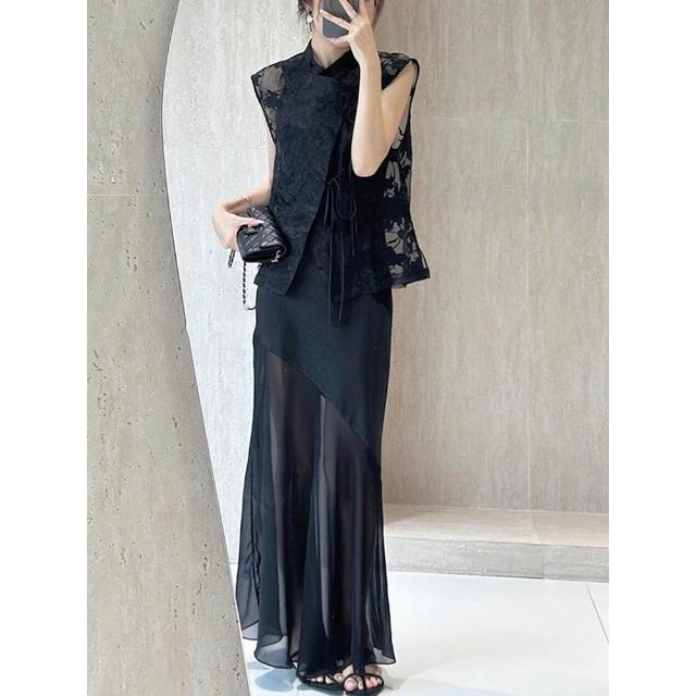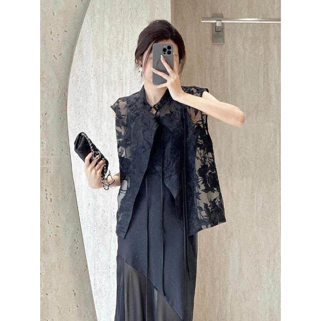 免運 新中式國風穿搭高端精致輕奢高級感重要場合黑色吊帶連衣裙套裝夏