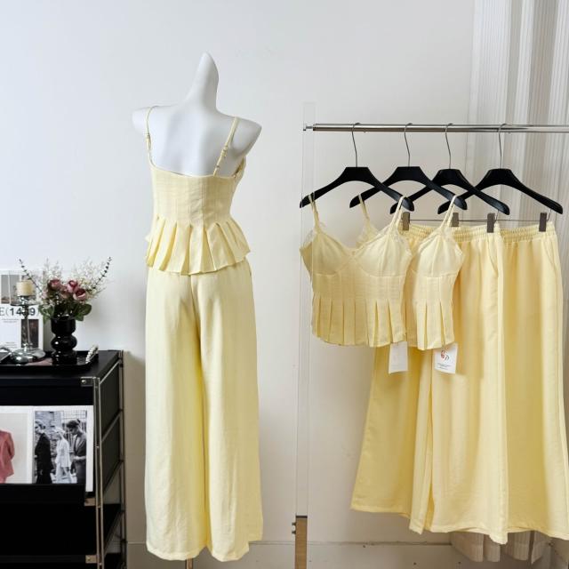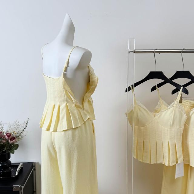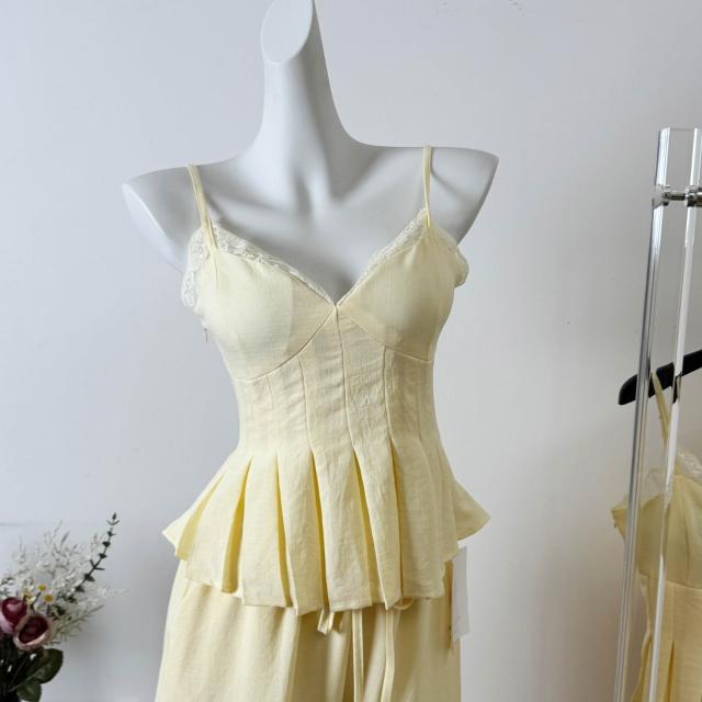 免運 辣妹休閒套裝女早春季性感純欲黃色蕾絲吊帶背心上衣長褲子兩件套