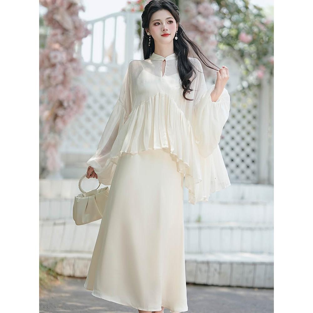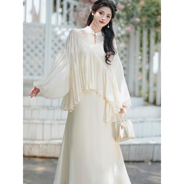 免運 夏季新中式白色長袖設計感氣質法式垂感寬鬆連衣裙兩件套套裝