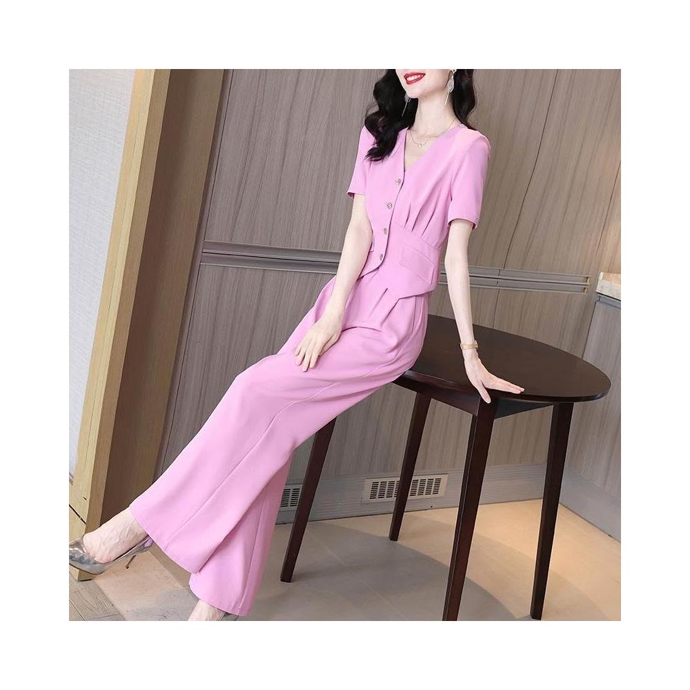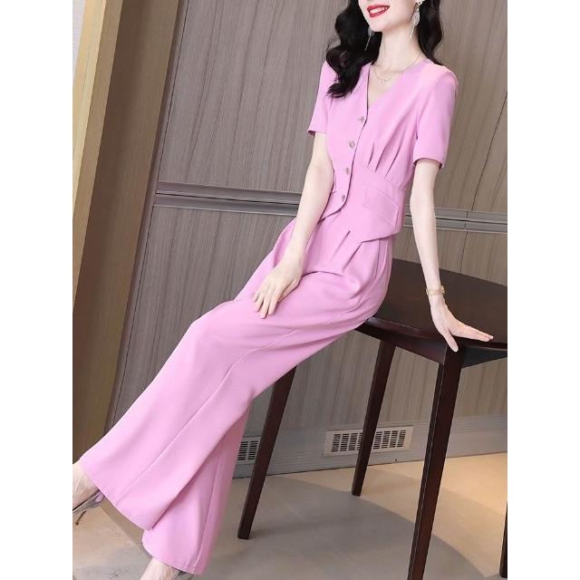 免運 夏季新款顯瘦遮肉簡約高級感薄款粉色v領西裝闊腿褲套裝兩件套女