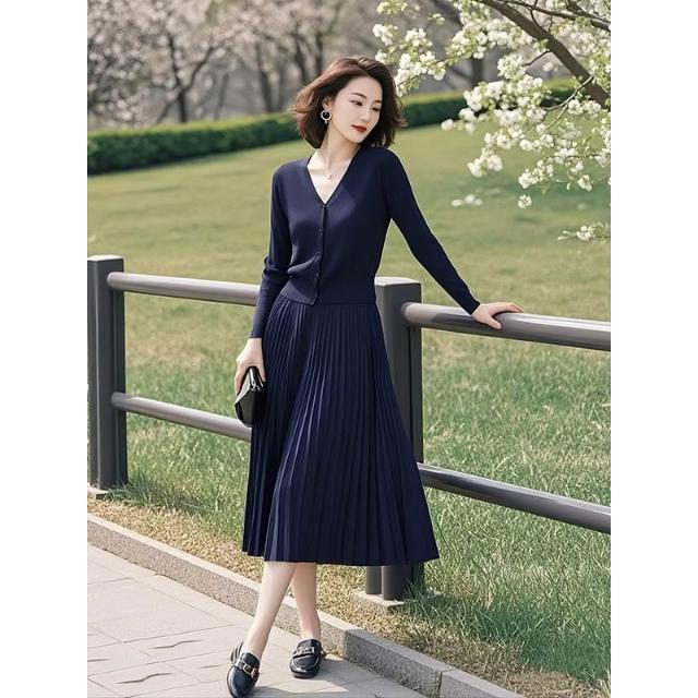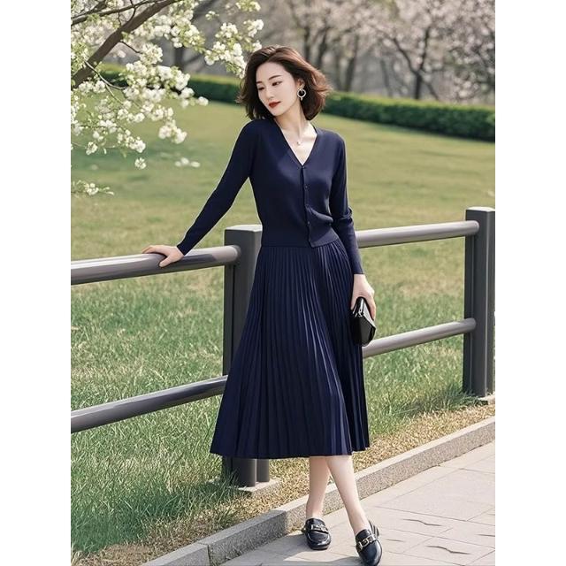 免運 深藍色針織套裝女裝2026春季新款韓版開衫上衣百褶半身裙子兩件套