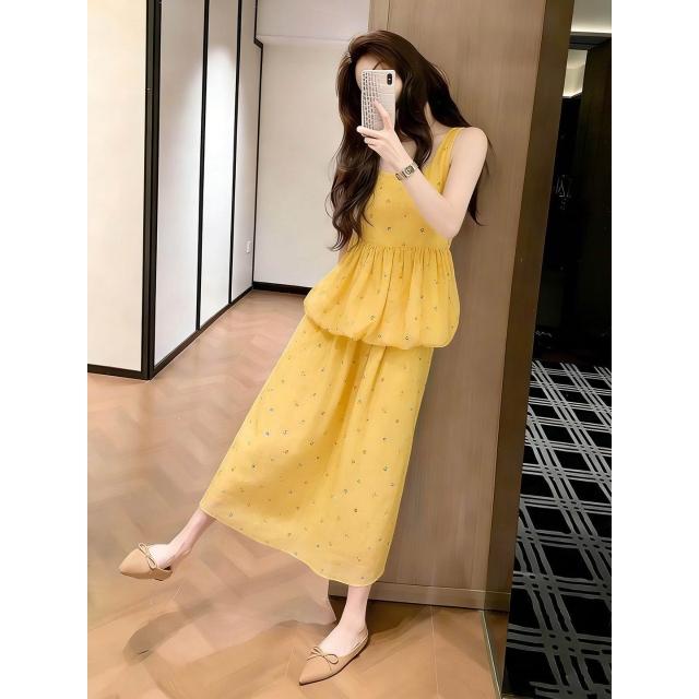 免運 黃色印花背心上衣半身裙兩件套女2026新款法式一整套ootd穿搭套裝