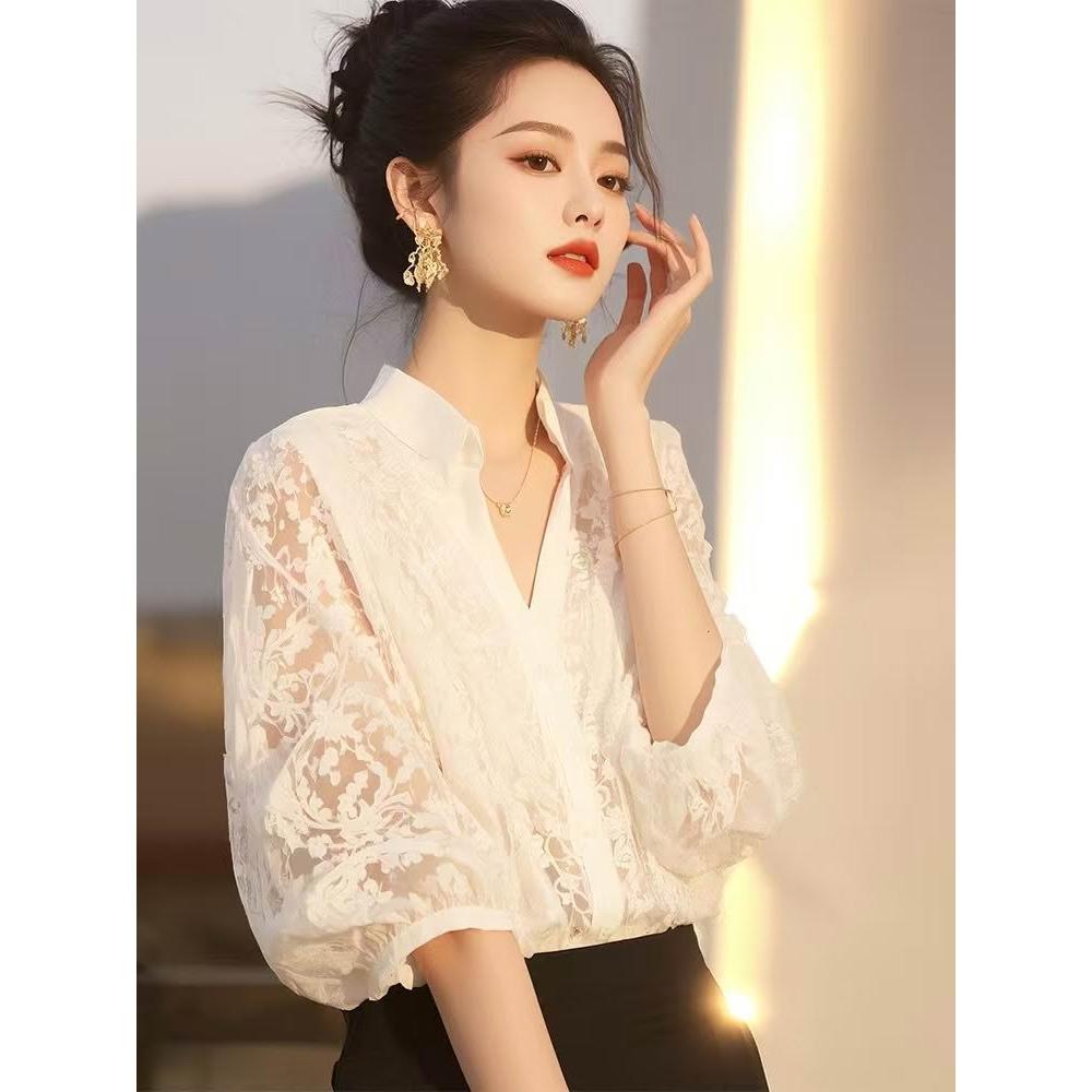 免運 今年流行獨特別致上衣輕奢高級感超好看減齡洋氣白色蕾絲襯衫春季