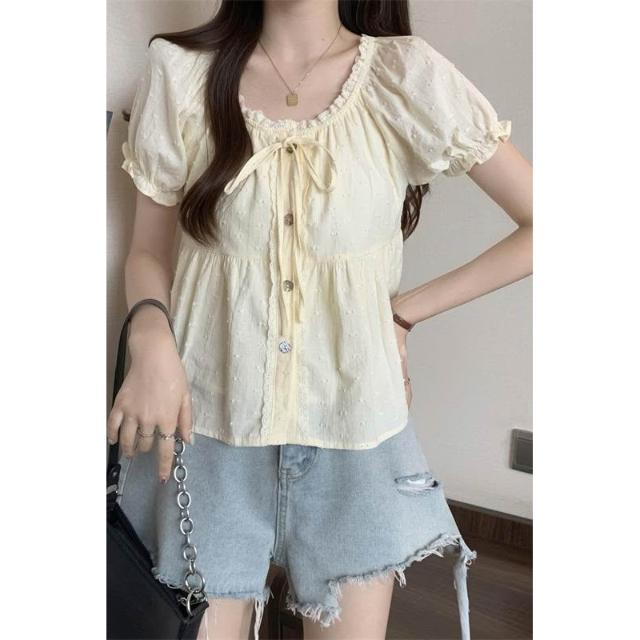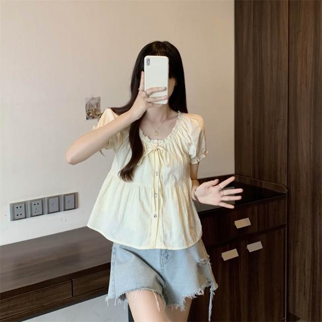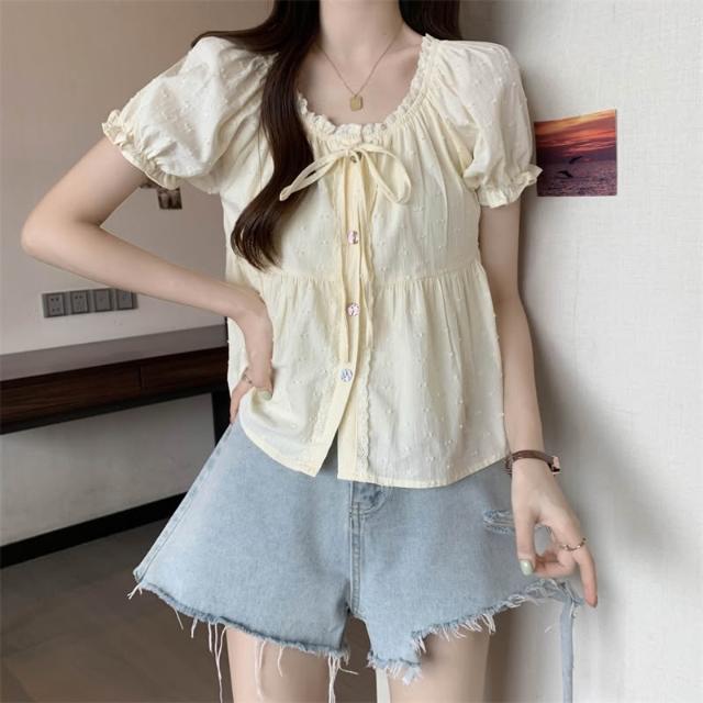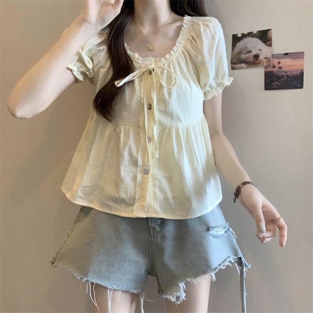 免運 大碼女裝日系花邊娃娃衫襯衫女夏2026新款短袖寬鬆大U領襯衣上衣