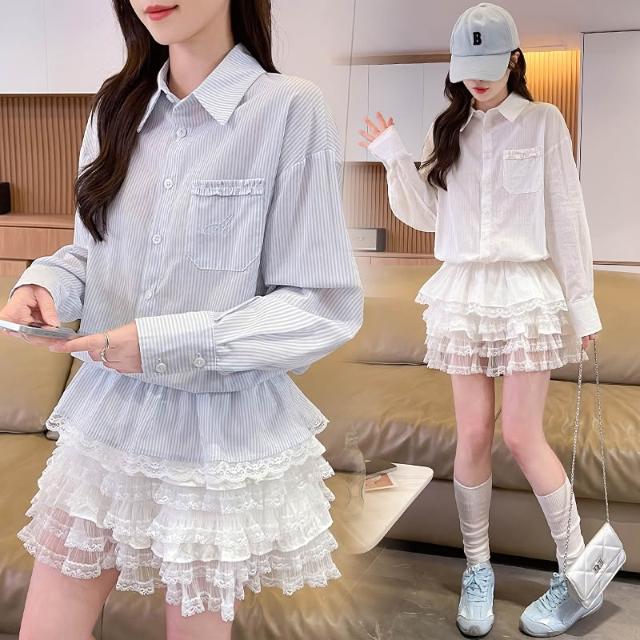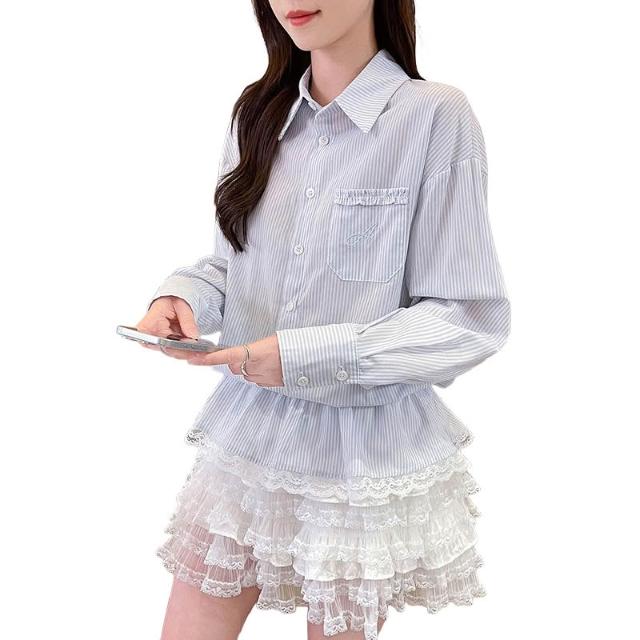 免運 實拍蕾絲拼接長袖女裝春夏季白色氣質收腰襯衫裙子設計感a字短裙