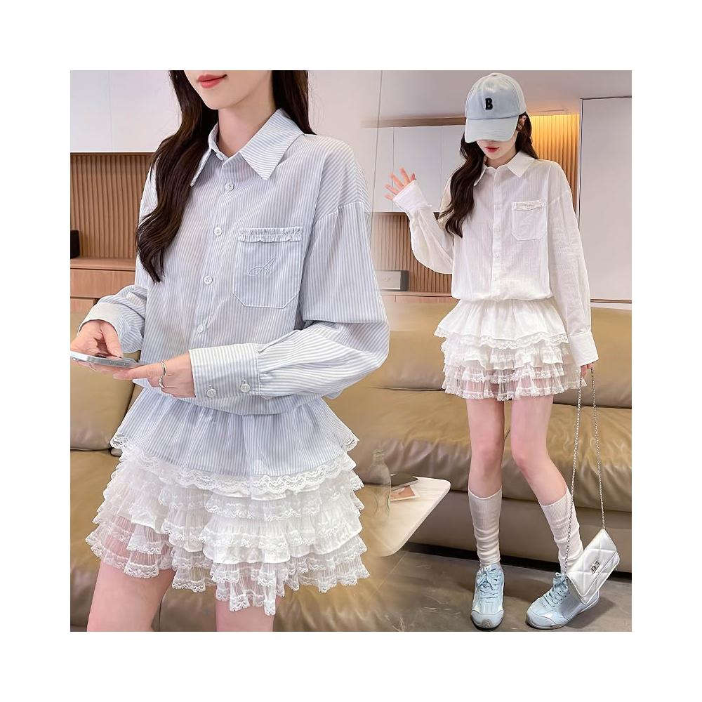 免運 實拍蕾絲拼接長袖女裝春夏季白色氣質收腰襯衫裙子設計感a字短裙