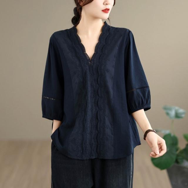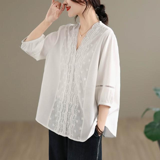 免運 實拍法式镂空花邊V領襯衫女2026夏季新款優雅別致寬鬆顯瘦上衣