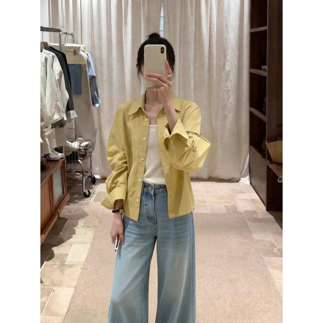 免運 韓系黃色polo領翻領開衫襯衣上衣女春秋外搭小個子寬鬆襯衣外套薄