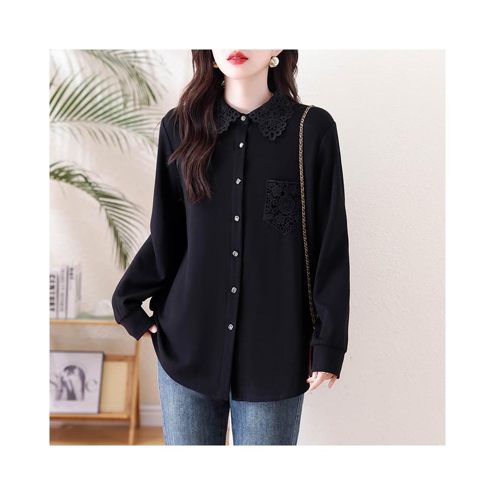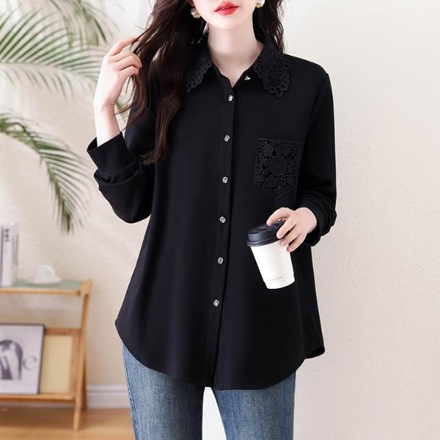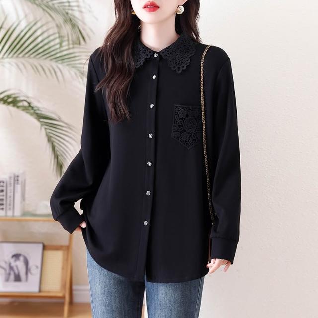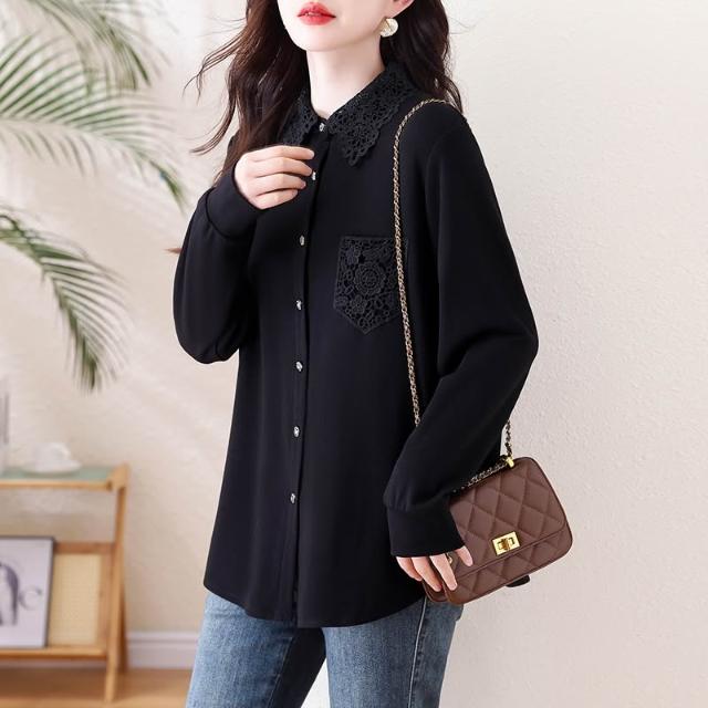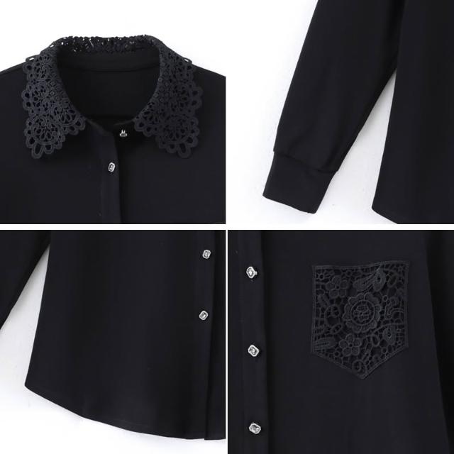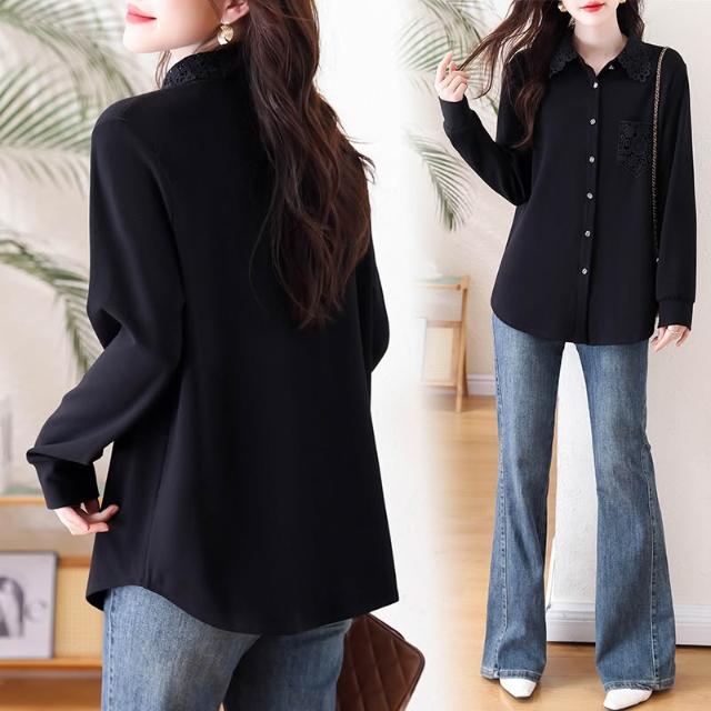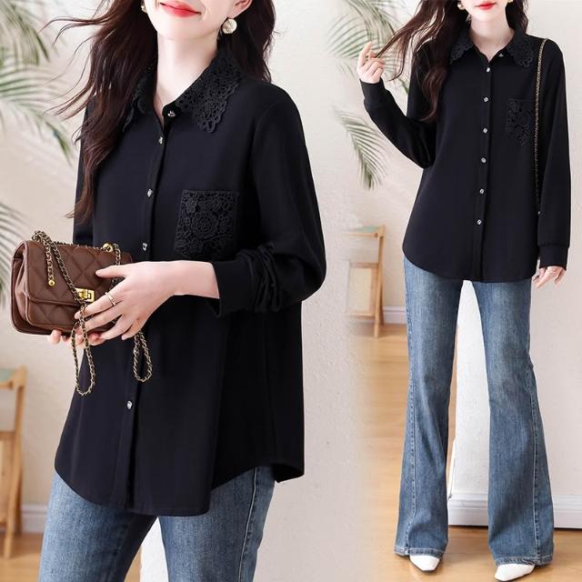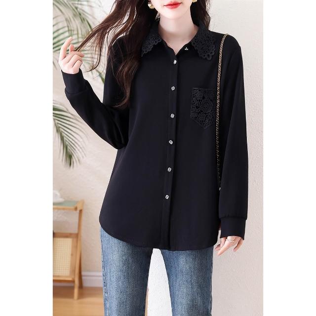免運 洋氣黑色蕾絲翻領襯衫 春季2026年新款上衣大碼歐貨長袖襯衣女