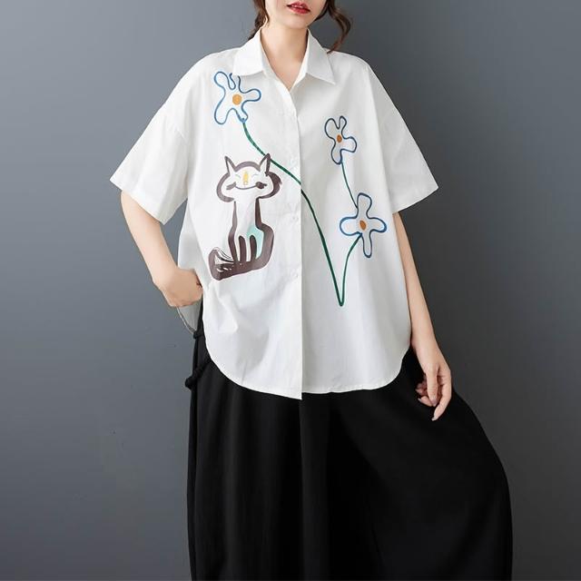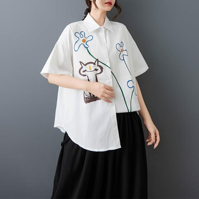 免運 2026夏季新款復古風純色短袖襯衫設計款卡通印花通勤顯瘦女上衣