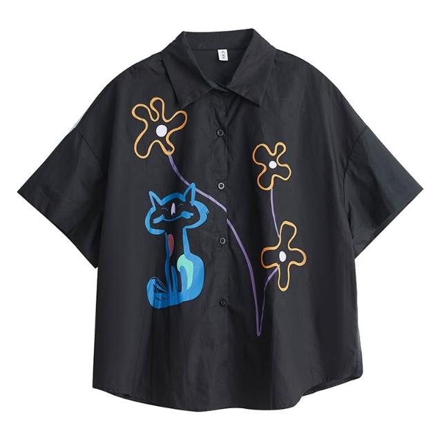 免運 2026夏季新款復古風純色短袖襯衫設計款卡通印花通勤顯瘦女上衣