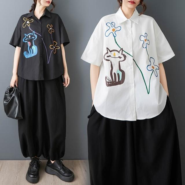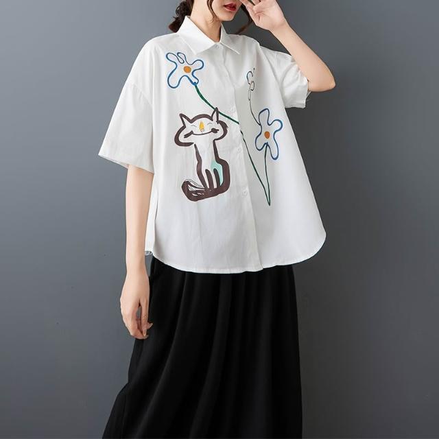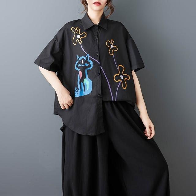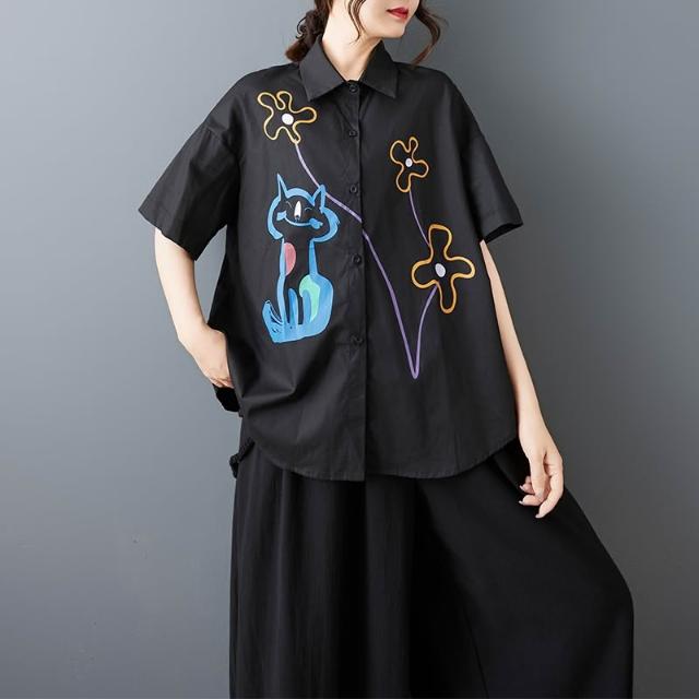 免運 2026夏季新款復古風純色短袖襯衫設計款卡通印花通勤顯瘦女上衣
