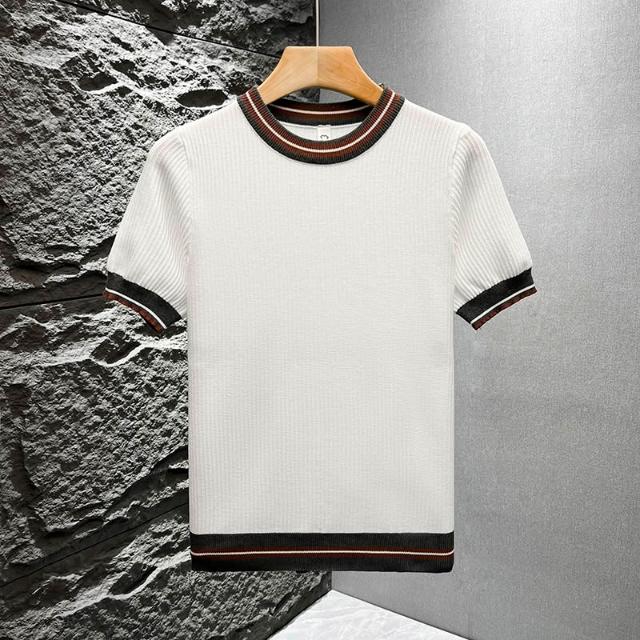 圓領撞色短袖T恤男士青年冰絲透氣復古美式.半袖針織衫薄款潮t