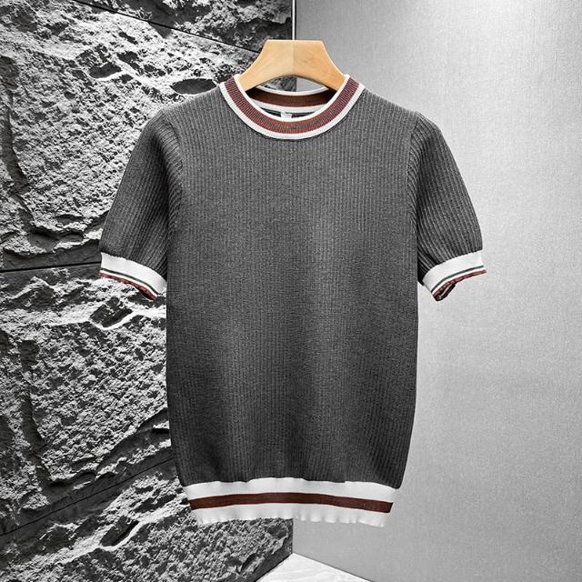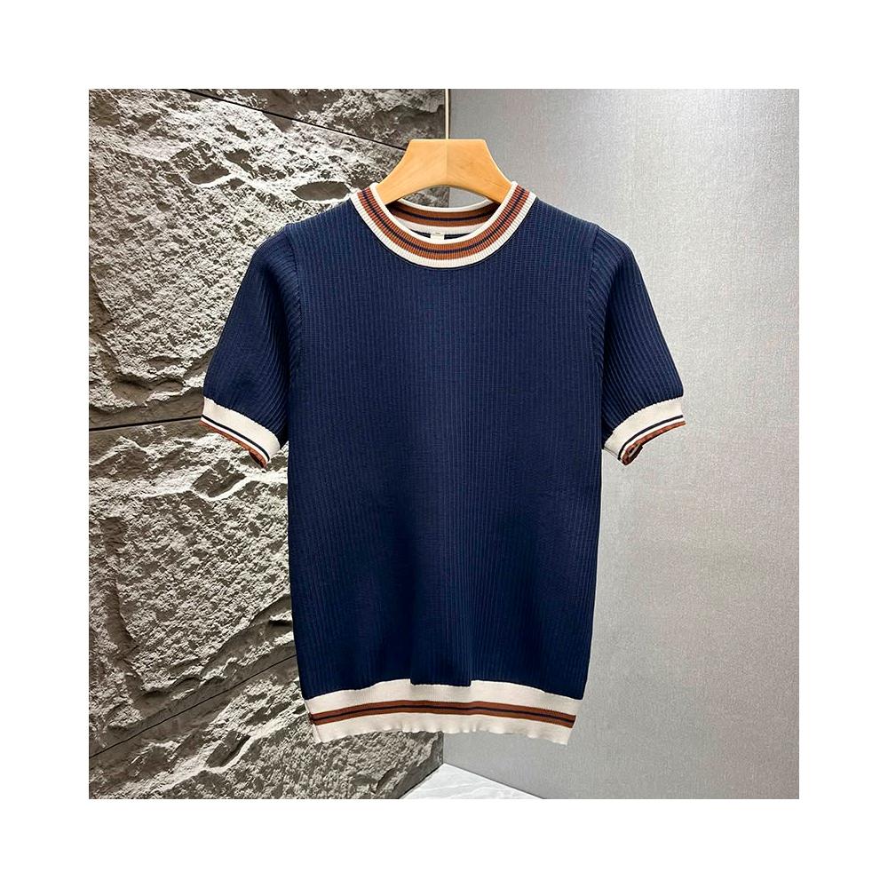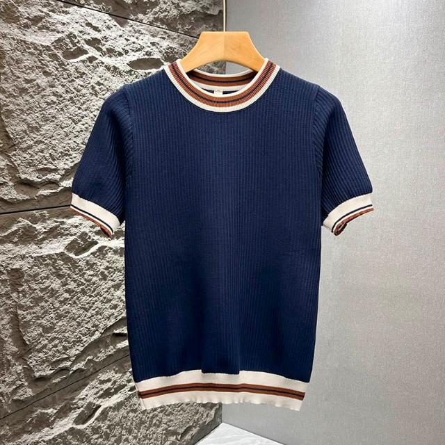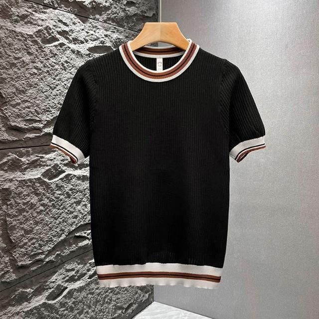 圓領撞色短袖T恤男士青年冰絲透氣復古美式.半袖針織衫薄款潮t