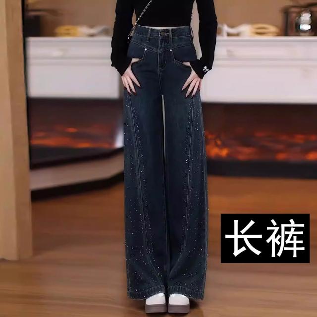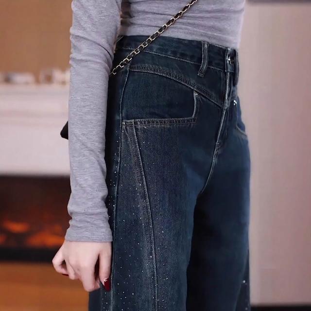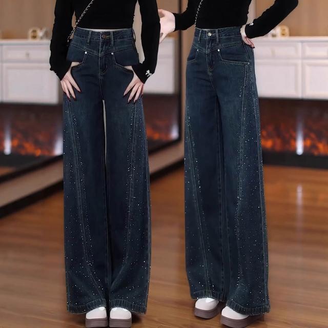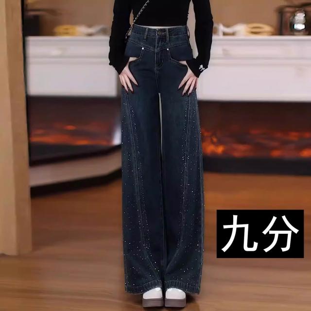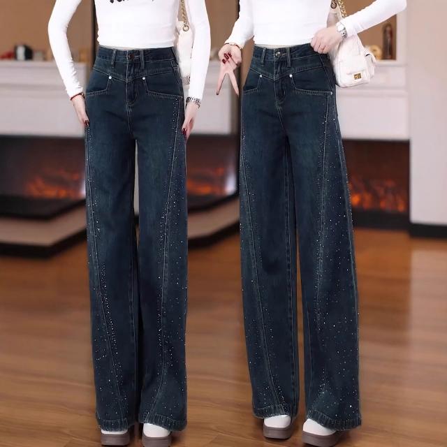 免運 復古藍闊腿牛仔褲女2026年春秋季新款燙鉆高腰大腳褲直筒拖地褲子