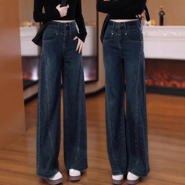 免運 復古藍闊腿牛仔褲女2026年春秋季新款燙鉆高腰大腳褲直筒拖地褲子