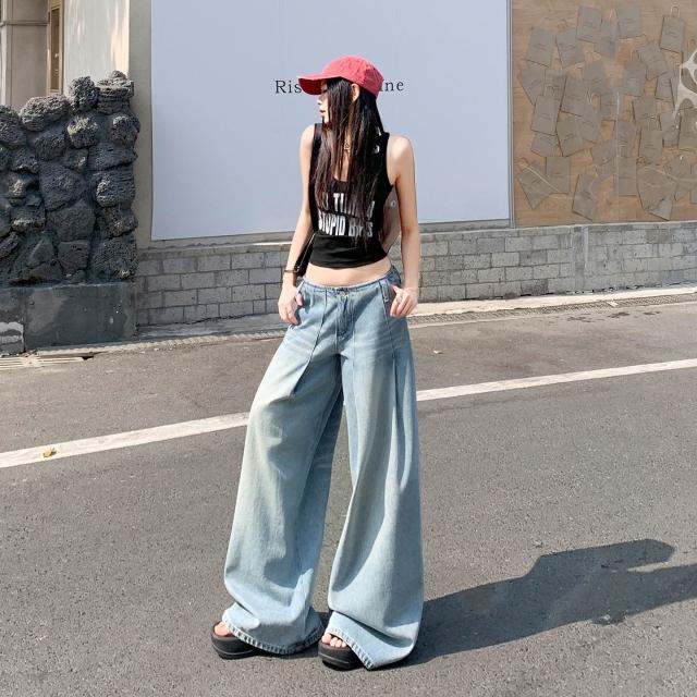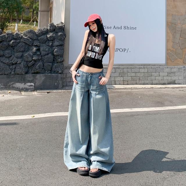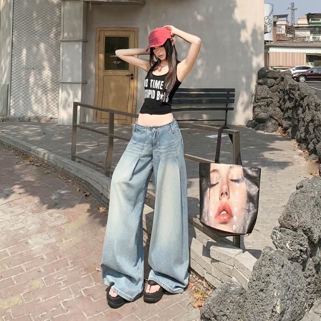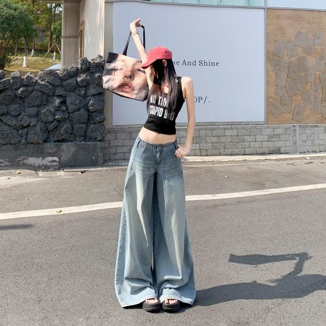 免運 無腰頭水洗淺藍闊腿牛仔褲女2026春季新款直筒寬鬆高腰顯瘦拖地褲
