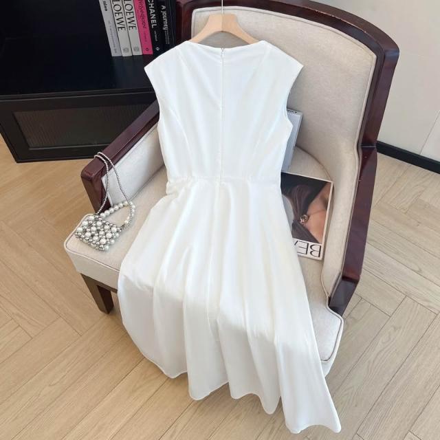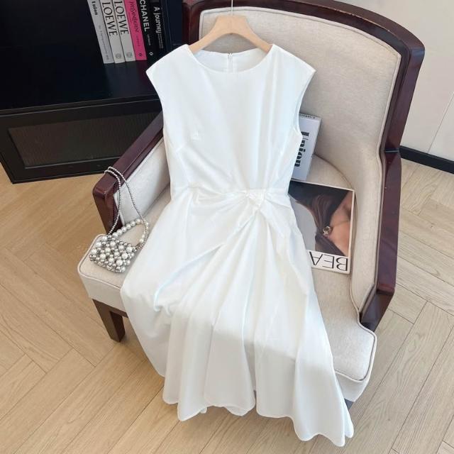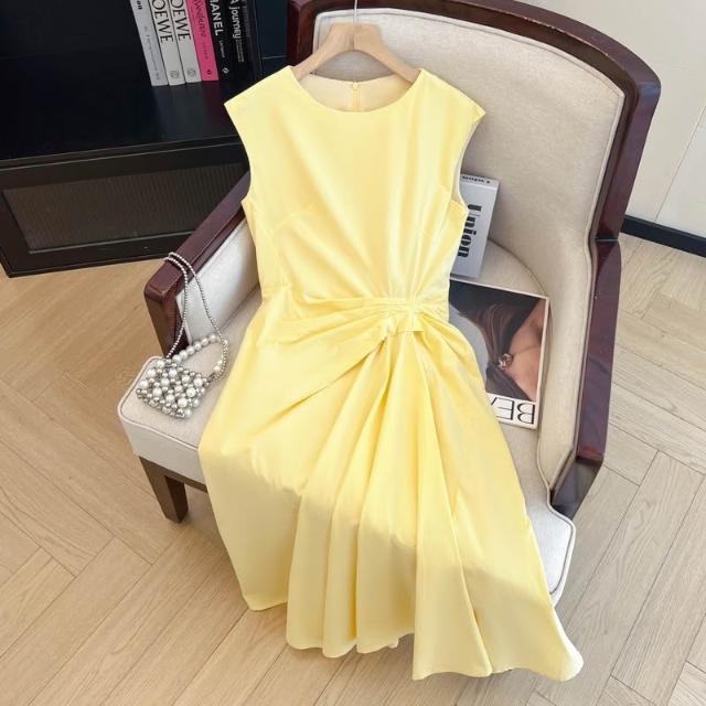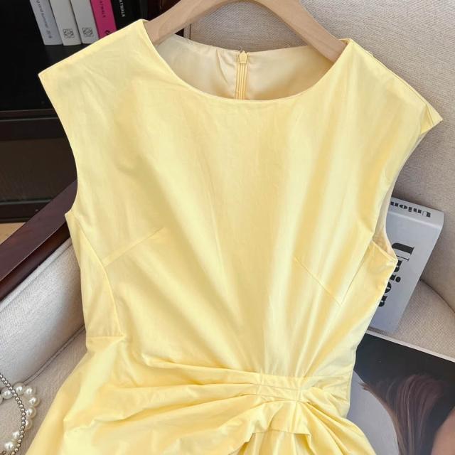 上實拍.100棉黃色設計感無袖扭結收腰連衣裙女夏季2025新款A字裙