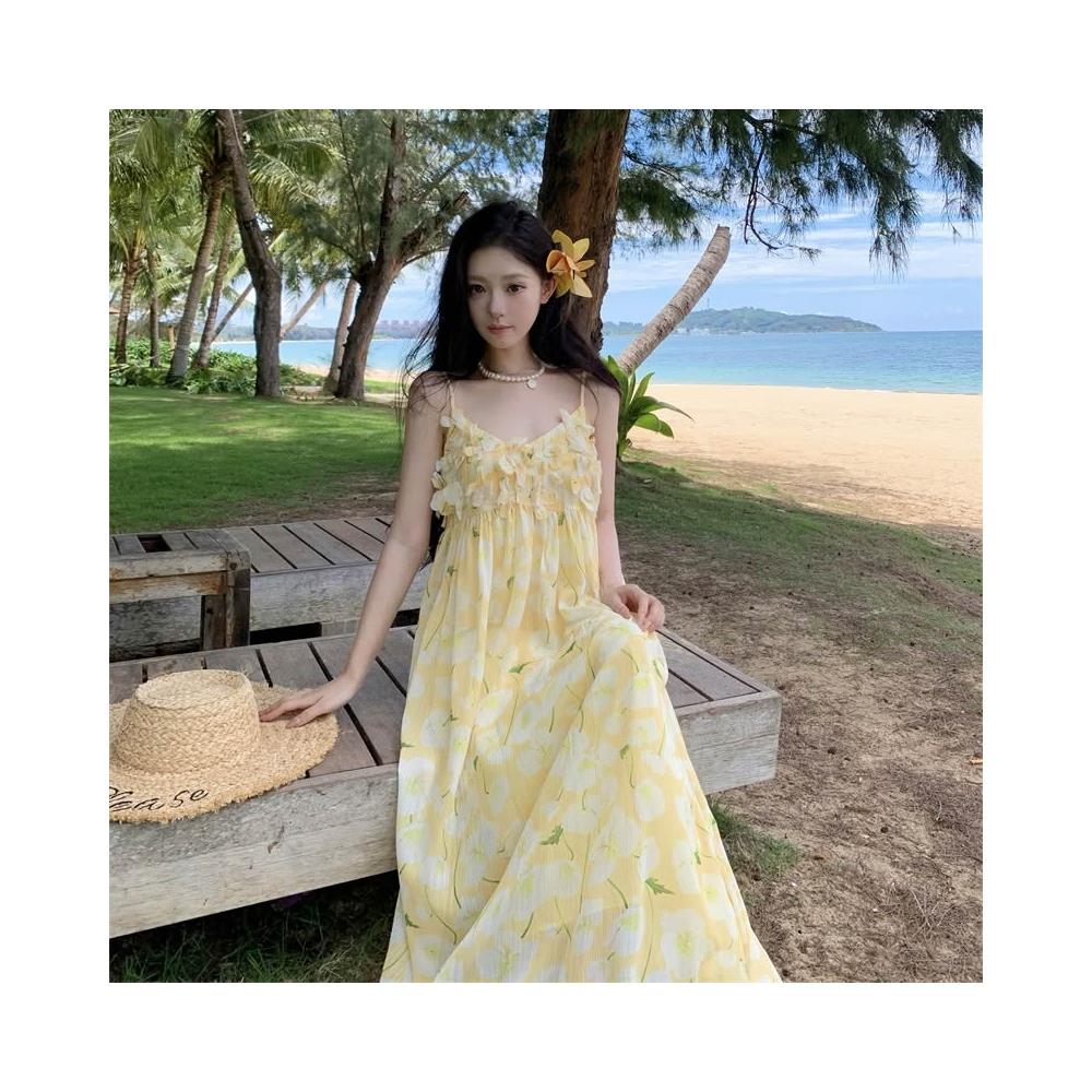 海邊度假黃色印花吊帶連衣裙女2025年新款法式性感夏日絕美小裙子