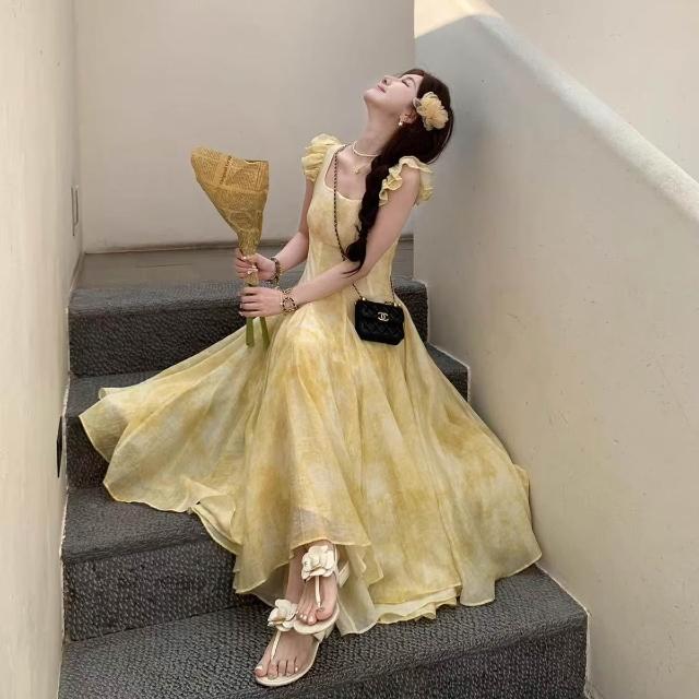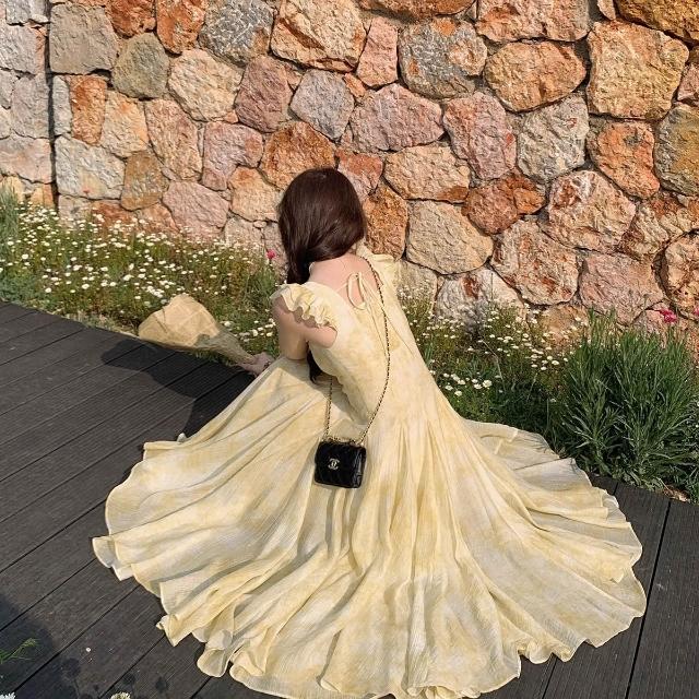 長款黃色海邊度假風連衣裙長裙2025新款顯瘦裙子女夏飛飛袖