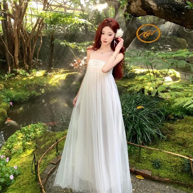 高級感網紗釘珠白色無袖連衣裙